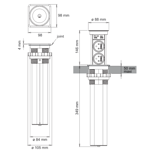 - 2 prises 16A 230V et 2 USB 2A 5V